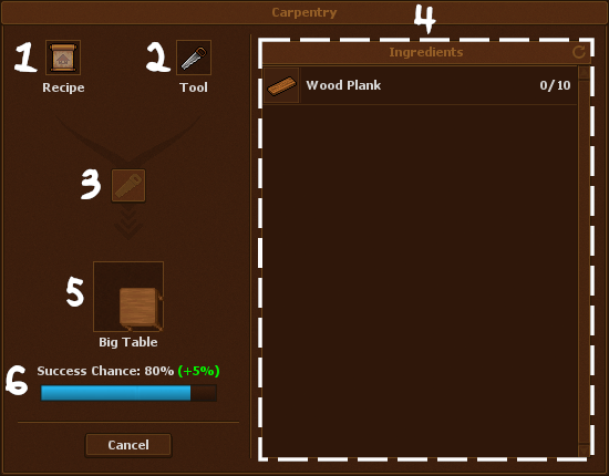 Carpentry allows you to build furniture using a recipe, carpentry tool and various ingredients. Each recipe has a base success chance, and each tool has an extra success chance.